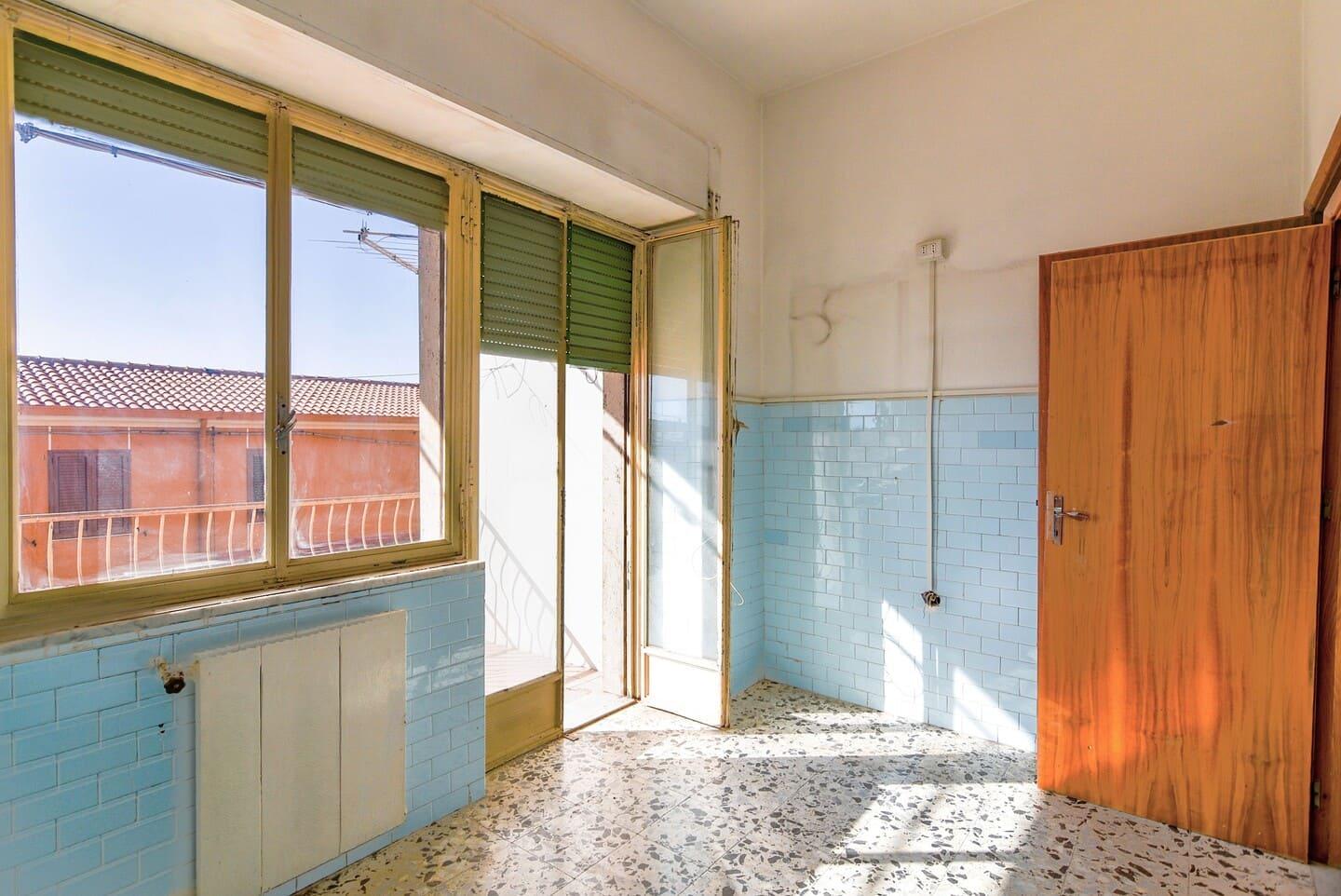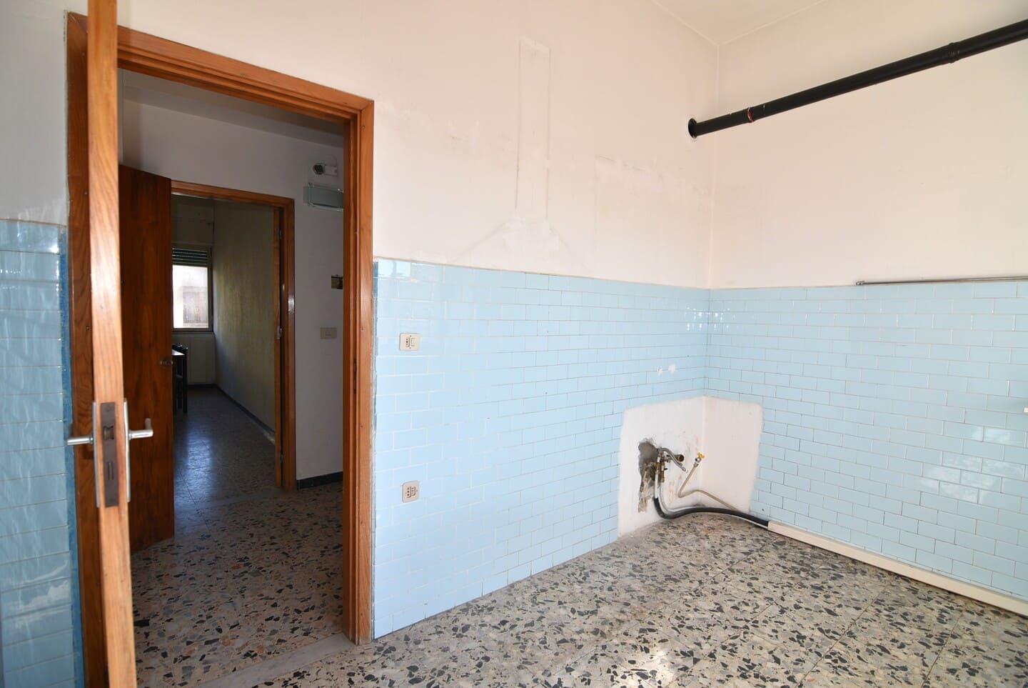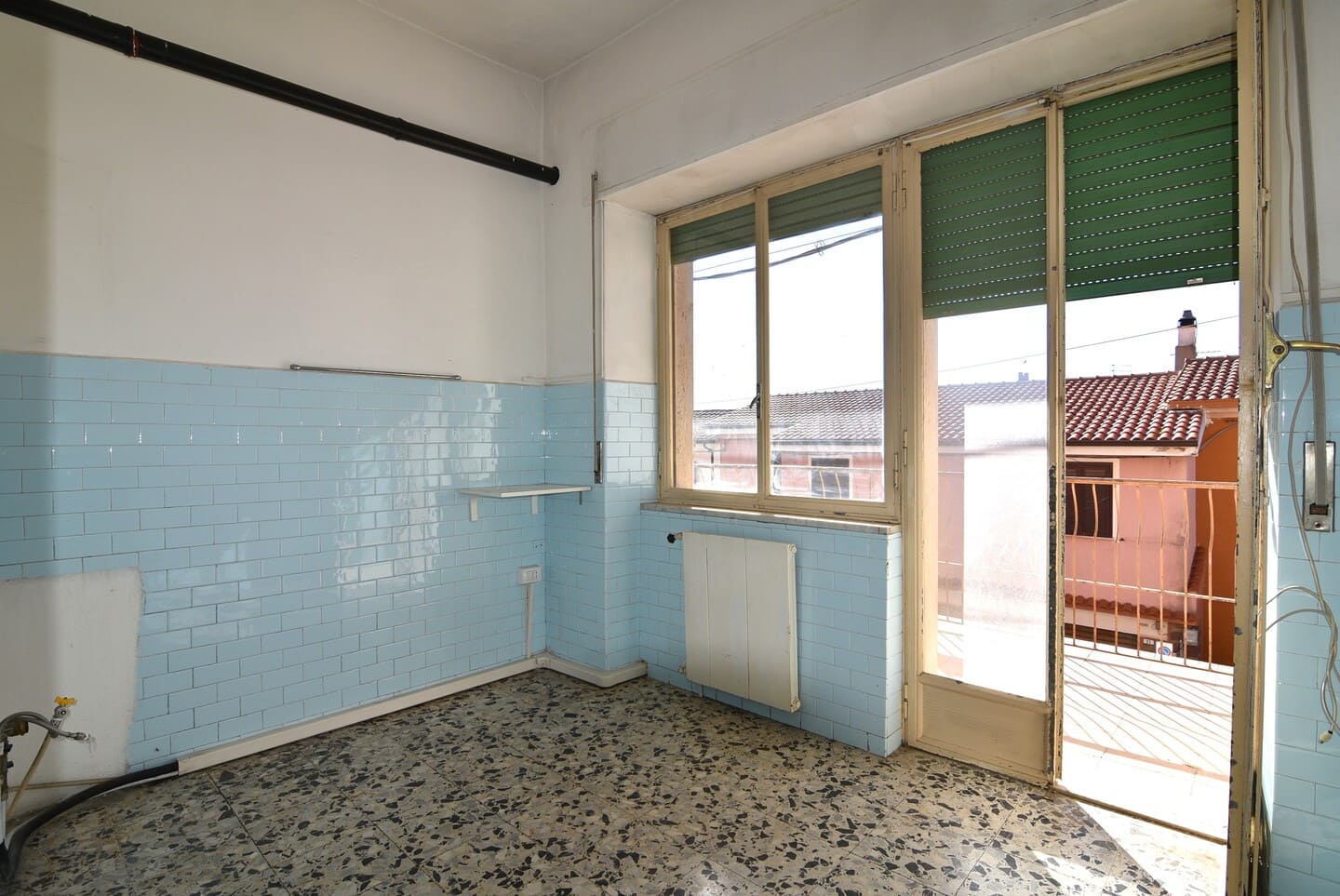 La cucina semiabitabile ha diretto accesso all’ambio balcone soleggiato e calpestabile, affacciato sulla via principale, che garantisce luminosità durante tutta la giornata.