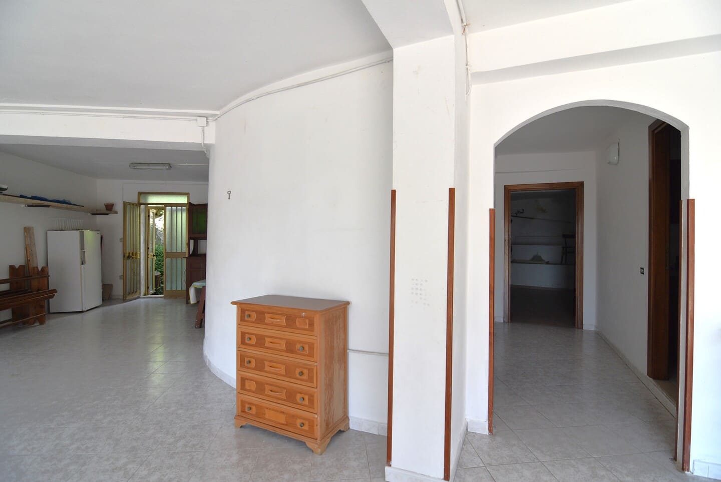 Qui si ha accesso alla cucina rustica con camino, un terzo bagno con lavanderia, una piccola area verde sul retro e due garage disposti in un unico ambiente e con capienza per tre auto totali.