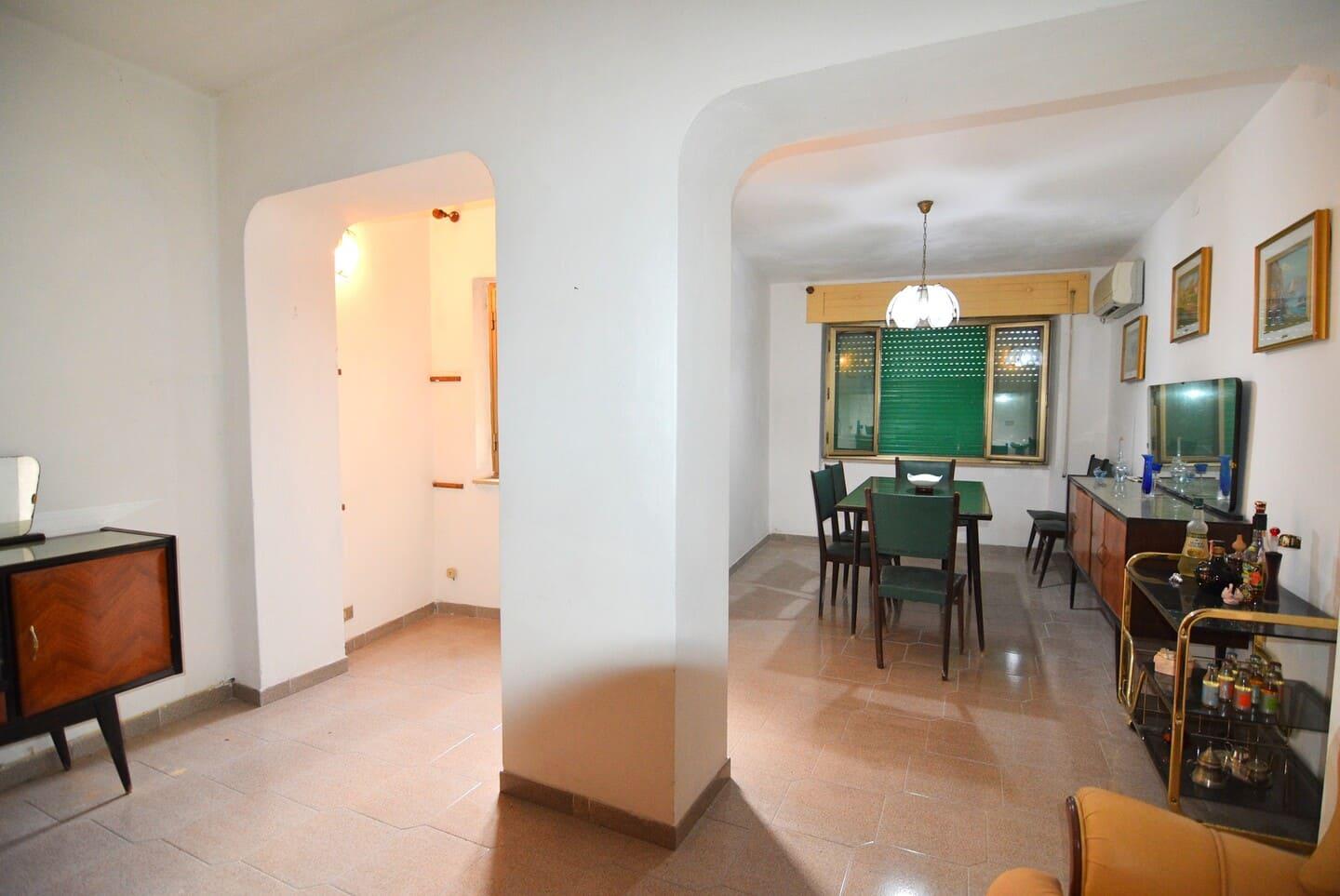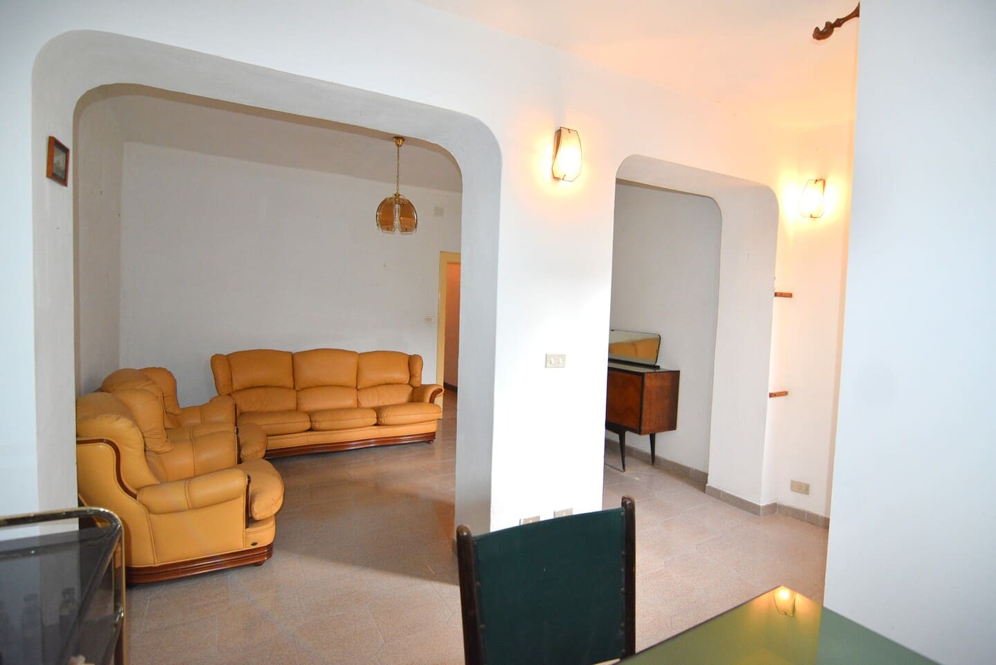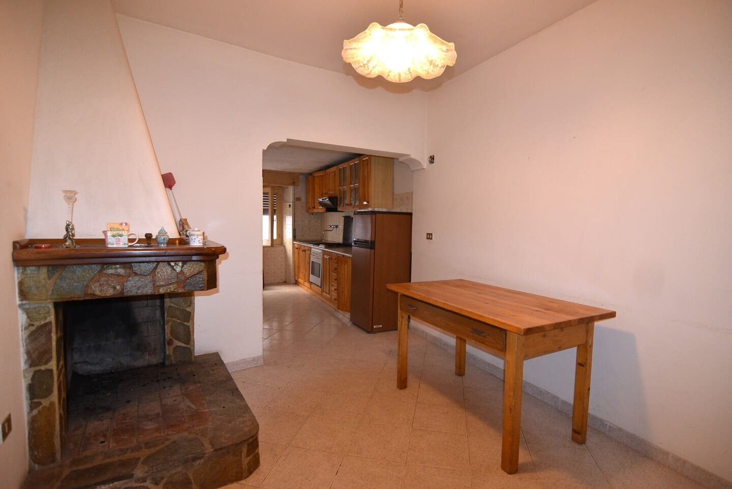 Il primo piano ospita un soggiorno luminoso, abbellito da eleganti arcate, e una spaziosa cucina completa di caminetto.