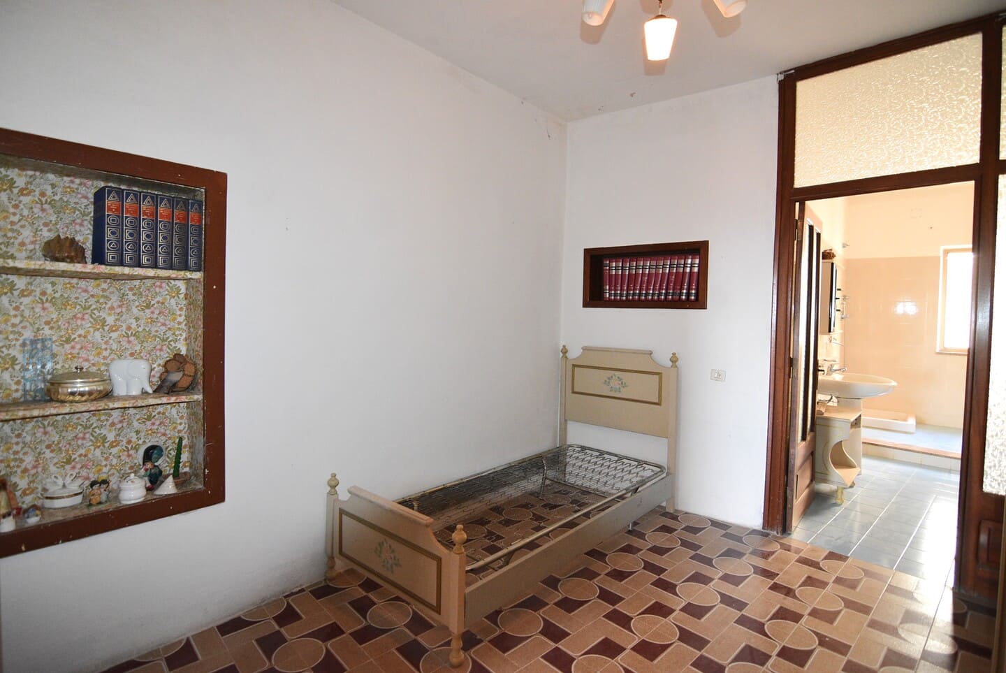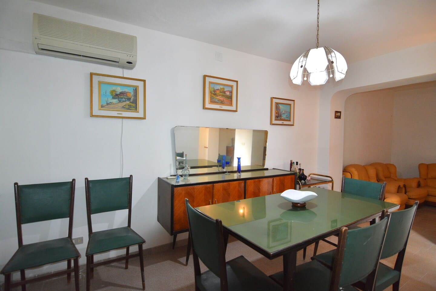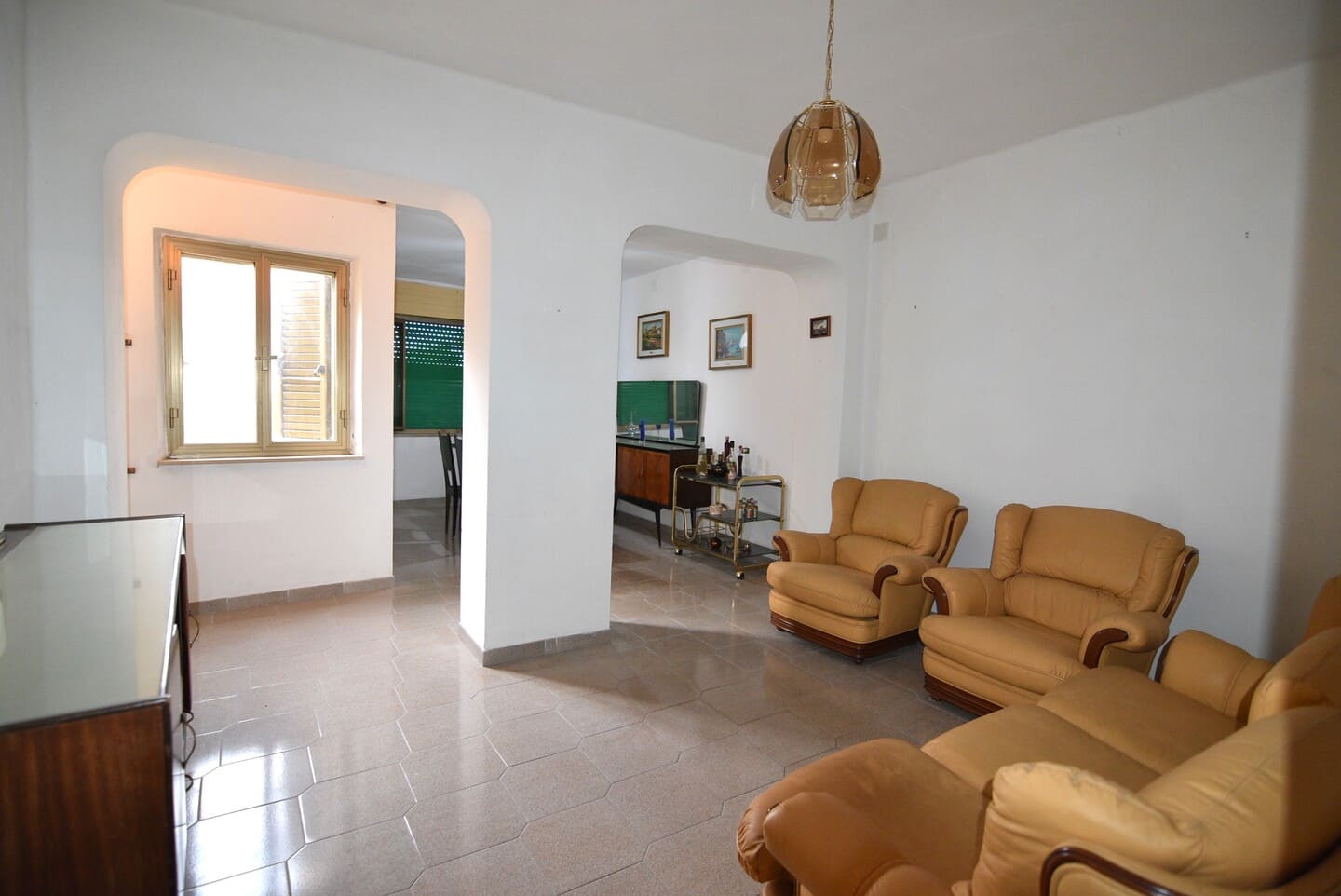 Il primo piano ospita un soggiorno luminoso, abbellito da eleganti arcate, e una spaziosa cucina completa di caminetto.